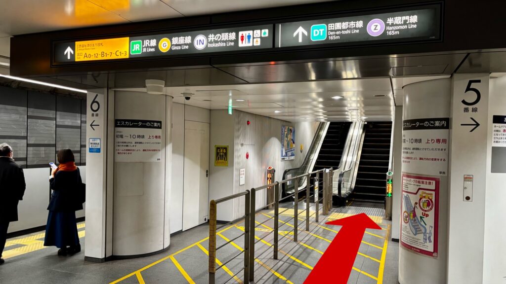 Shibuya Station is a massive hub often called a “labyrinth.” When arriving from Yokohama or Motomachi-Chukagai on the Toyoko Line, you land at the 5th basement floor (B5F). While the path to the Ginza Line platform on the 3rd floor is mostly a series of escalators, there are so many intersecting escalators along the way that it’s easy to pick the wrong one (note that the gate is on the ground floor).